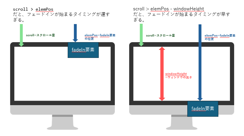 var elemPos = $(this).offset().top, //windowHeightの上端からfadeIn(現在処理している要素の位置=ページ上部からの距離)を取得し、elemPosという変数に格納します。⇒つまり、fadeInという名前がついた要素が画面の上端からどの位置にいるかの情報を取得しているということです。