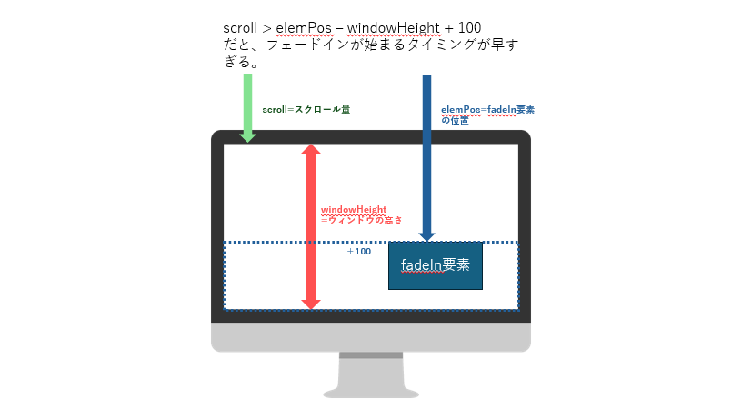 if (scroll > elemPos - windowHeight + 100){ //スクロール位置が要素の表示位置に達したかどうかをチェックしています。達してから処理を始めては遅いので、達する少し前(100のマージン)に始めます。